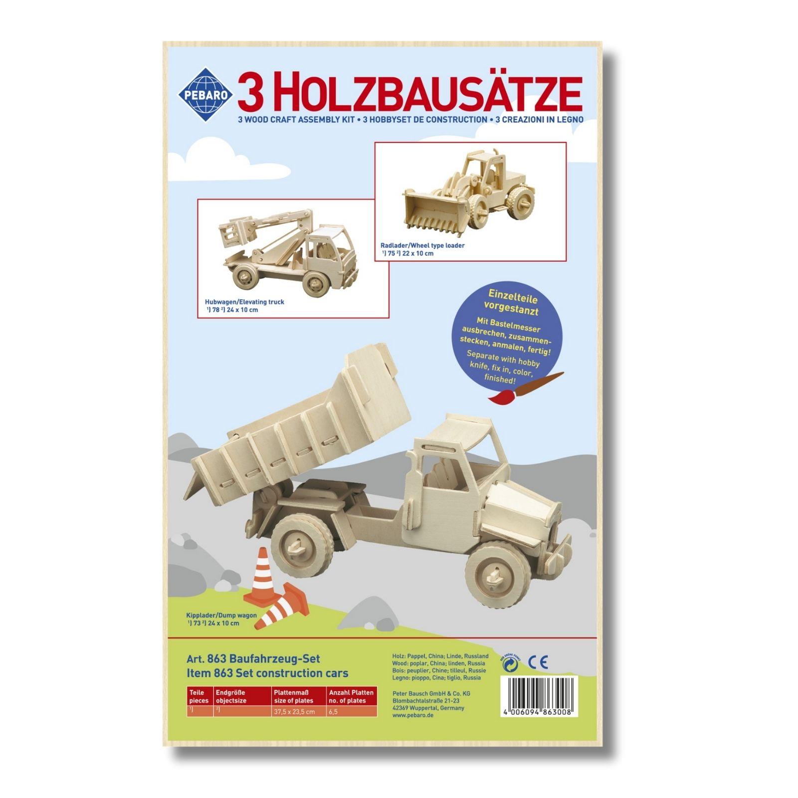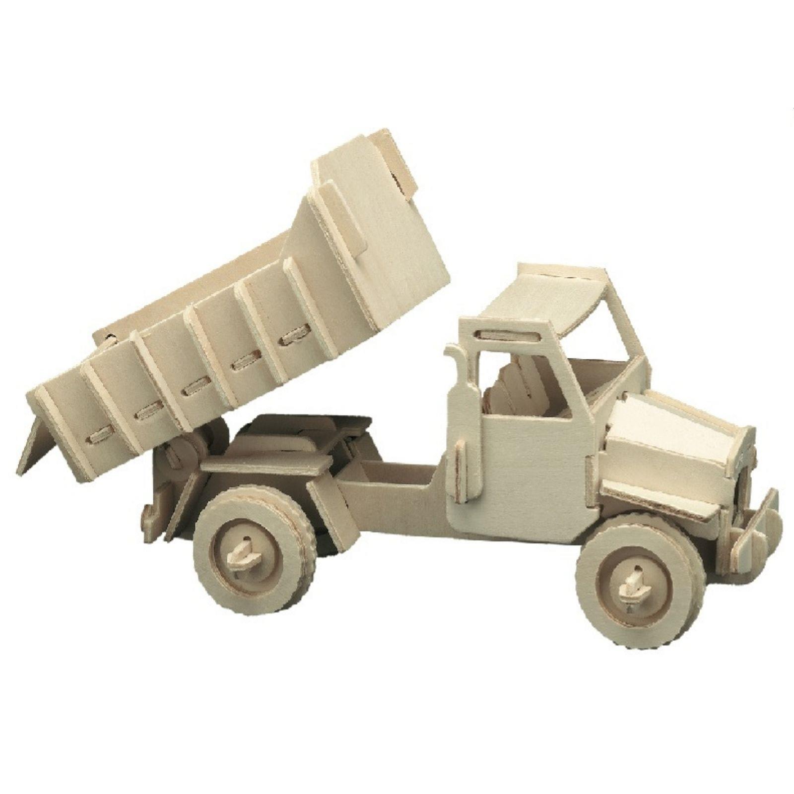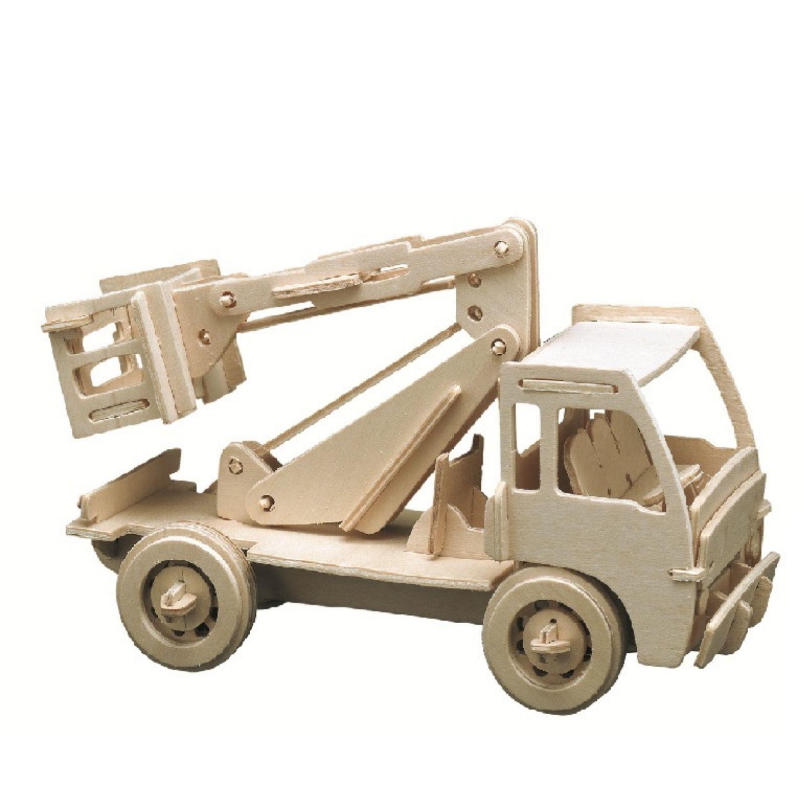 Set za sastavljanje od drvenih dijelova koje treba odvojiti od podloge i sastaviti. Kiper, kamion s dizalicom i bager.
