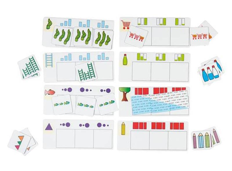 Igra sadrži 8 plastificiranih kartica sa zadacima i praznim poljima, 24 kartice s motivima na temu veličine, debljine i dužine te upute za igru.