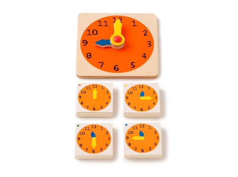 Igra sadrži drveni sat dim. 14x14 cm, 48 kartica vremena dim. 6x6 cm i upute.