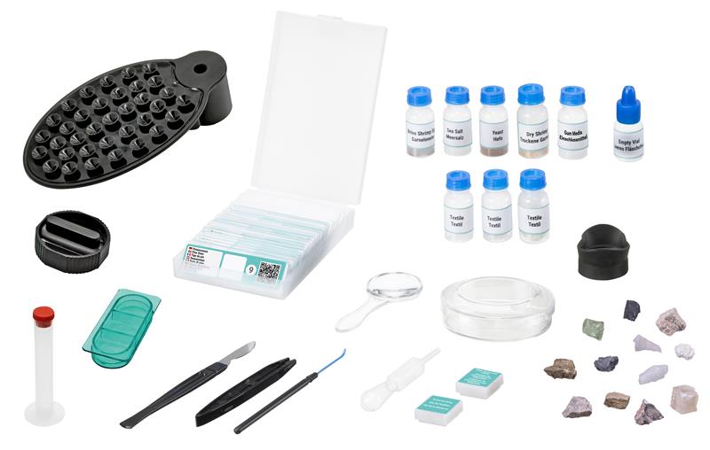 Sadrži: držač za pametni telefon, 20 uzoraka s QR kodom za svako stakalce, 7 praznih slajdova, 5 bočica s uzorcima, komplet za pokuse (kutija za povećalo, jaja od račića, kvasac), morsku sol, 1 prazna bočica, kutiju za slajdove, povećalo, iglu za seciranje, pipetu, pincetu, skalpel, petrijevu zdjelica, 8 pokrovnih stakala i 8 naljepnica, primjerak krila leptira, 12 malih kamenčića - pojedinačni opisi dostupni putem QR koda, okulari za one koji nose naočale, MicroCut, mjerni cilindar, 2x AA baterije