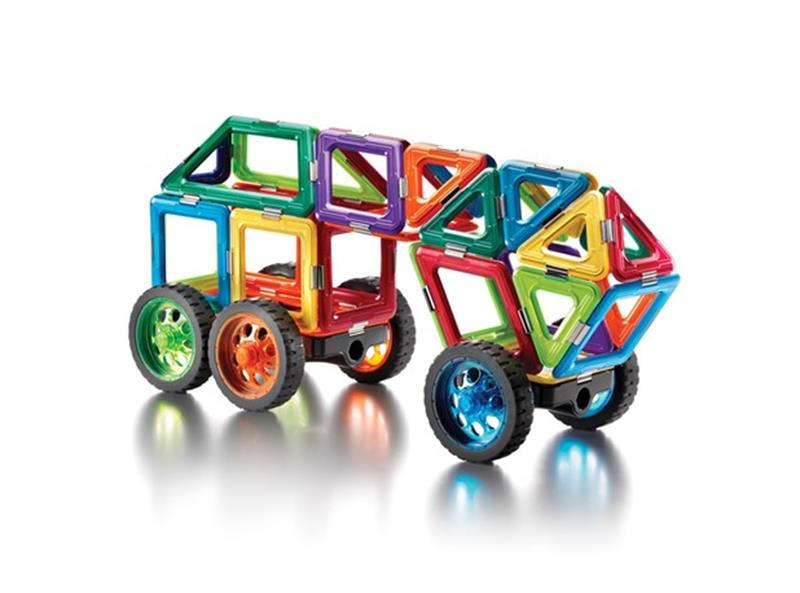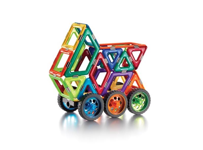Komplet sadrži elemente kao što su: kvadrati, trokuti, rombovi, valjci, kotači,... i predloške za konstruiranje.