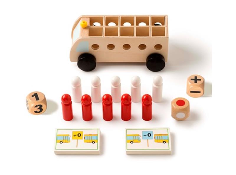 U kompletu dolazi drveni autobus dimenzije 18x10x7 cm, 5 crvenih putnika, 5 bijelih putnika, 22 kartice sa zadacima i upute.