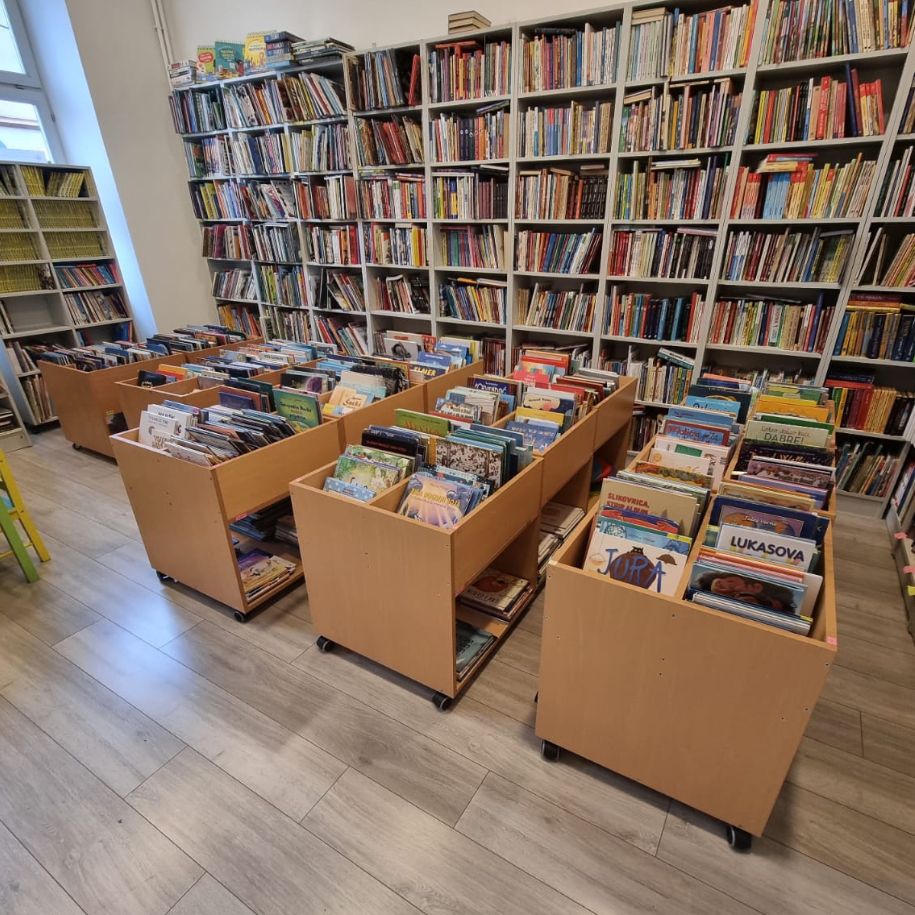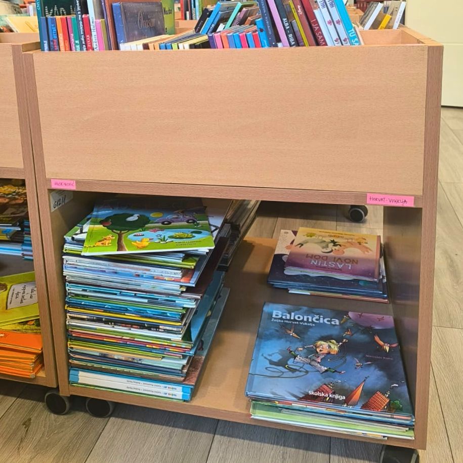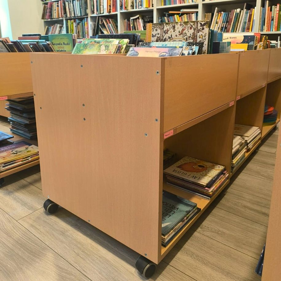 Uz regale odabrali su i korita za slikovnice koja su na kotačićima te se lako pomiču i time se prostor knjižnice lako prilagođava i mijenja prema raznim aktivnostima.