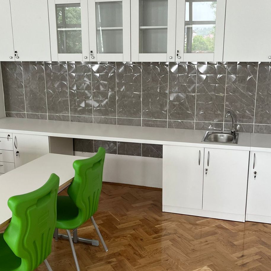 Svjesni da kvalitetno i moderno opremljen kabinet omogućuje jednostavno pranje i održavanje opreme te sigurno odlaganje i da se na taj način oslobađa više vremena za izvođenje vježbi i pokusa, u ovoj školi su odabrali gornje i donje elemente s mogućnošću zaključavanja te s ugrađenim sudoperom na radnoj plohi.