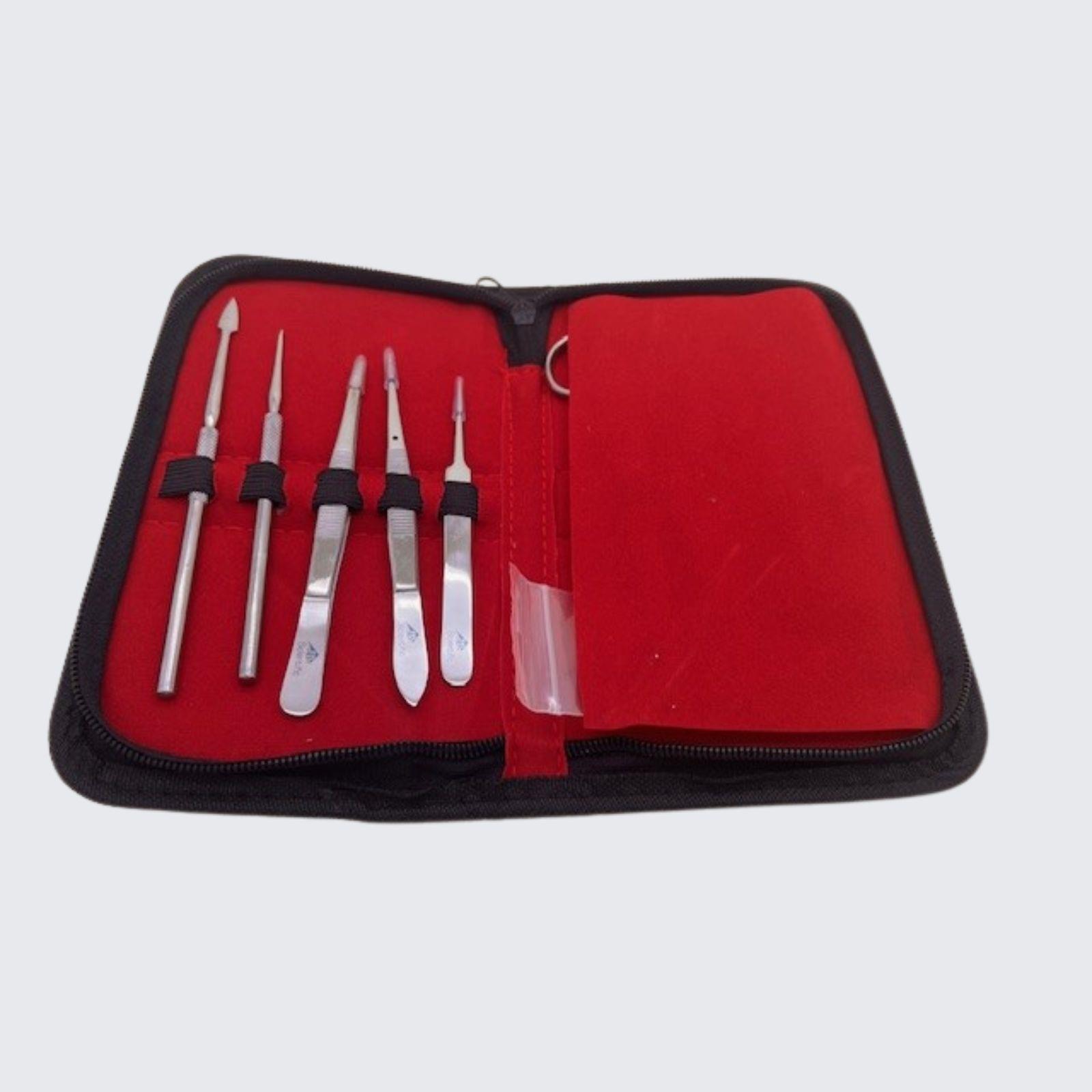 Sadržaj: 2 para škara, 11,5 cm i 14,5 cm, 1 par pinceta, oštri vrh, sa stabljikom, 11,5 cm, 1 par pinceta, tup vrh, 14 cm, 1 par pinceta, oštar vrh, 12 cm, 1 jednodijelni skalpel, 4 cm oštrica, 1 držač noža za skalpel, 5 nožića za skalpel, 1 igla za seciranje, 13 cm, 1 igla za seciranje, lanceta, 15 cm