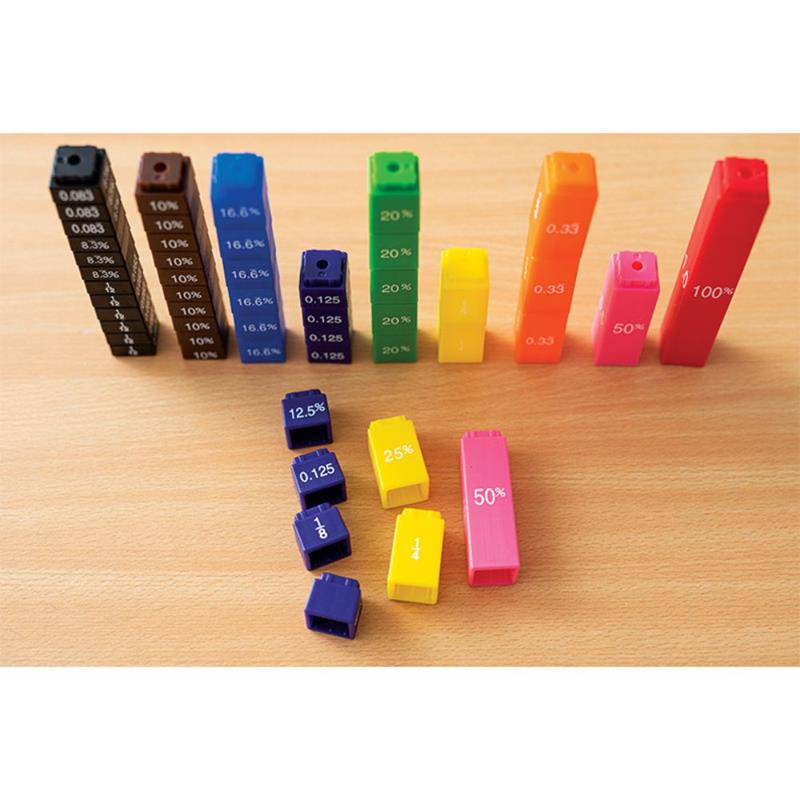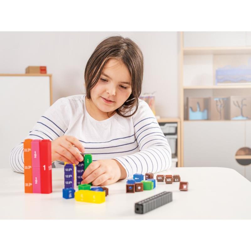 Svaki razlomak prikazan je jednom bojom i količinom kockica koje čine jednu cjelinu.Set pomaže učenicima da razumiju koncept proširivanja i smanjivanja razlomaka te izvođenja aritmetičkih operacija s razlomcima.