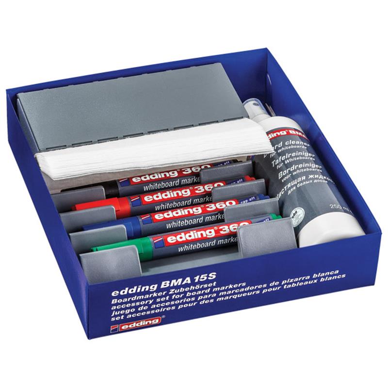 Sadrži: 4 markera (boje: crna, crvena, plava i zelena), magnetni držač za markere, brisač, sprej za čišćenje i 20 rezervnih uložaka za brisač