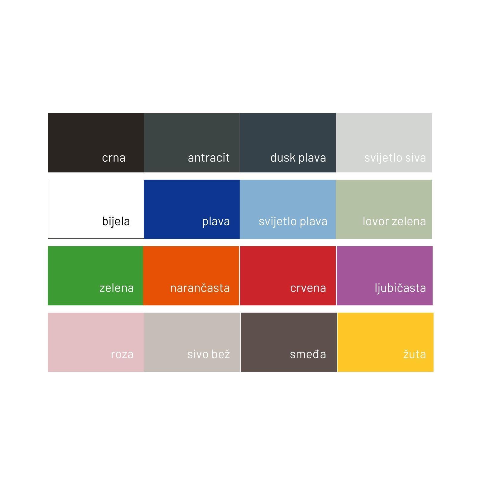 žuta (123), antracit (446), plava (661), bijela (000),smeđa (411), svijetlo siva (427), dusk plava (432), narančasta (166), lovor zelena (623), sivo bež (406), crna (100), svijetlo plava (2169), roza (692), zelena (362), crvena (1797), ljubičasta (7656)
